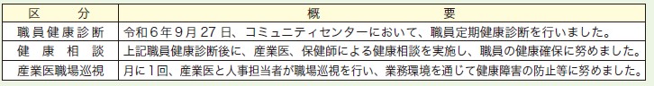 労働安全衛生法等に基づき、衛生委員会の設置、産業医及び衛生管理者等の配置を行い、快適な職場環境の実現と職場における職員の安全と健康の確保のため安全衛生管理体制を整備しています。