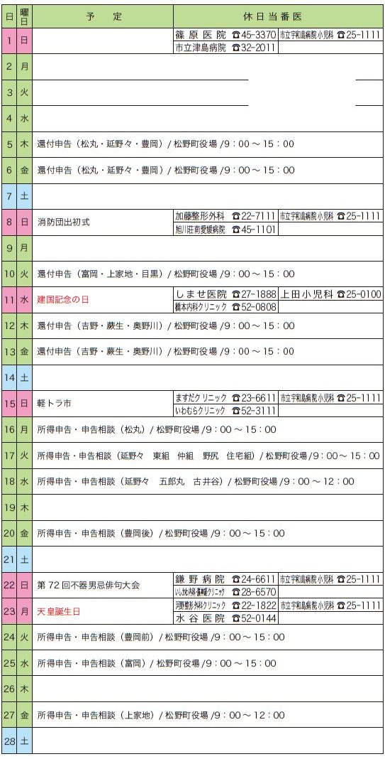 くらし 2月の森の国行事予定表 26/28 前の記事 次の記事 発行日 : 2026年01月22日 自治体名 : 愛媛県松野町 広報紙名 : 広報まつの 令和8年2月号 ※休日当番医は、変更になることがありますので、新聞や電話等で確認し、事前に症状を説明し受診しましょう。 Tweet シェアする 年金コーナー ごみ収集日程表