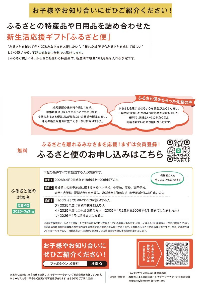 くらし FAVTOWNとは転出者と「ふるさと」をつなぐ情報発信・交流の場です。 22/28 前の記事 次の記事 発行日 : 2026年01月22日 自治体名 : 愛媛県松野町 広報紙名 : 広報まつの 令和8年2月号 Tweet シェアする 令和8年度交通災害共済の加入を受け付けています。 新民生委員・児童委員を紹介します