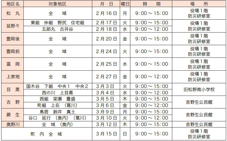 所得申告の時期となりました。それぞれの地区ごとに申告の受付と相談を行いますので、日程表をご確認の上お越しください。なお、それぞれの地区で申告できない人は、庁舎などで申告受付を行いますので、3月16日(月)までに申告をしてください。