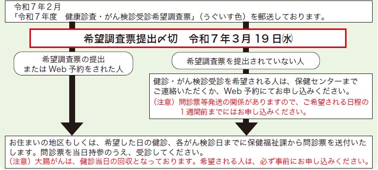 上記2つの方法で受け付けております。詳細については、令和7年2月に送付しております「令和7年度健康診査・がん検診受診希望調査の実施について」をご覧ください。