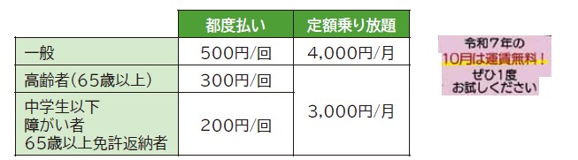 定額制なら期間中何度でも追加料金なしで利用でき、乗れば乗るほどお得です。令和7年10月は無料でご利用いただけますので、ぜひお試しください。