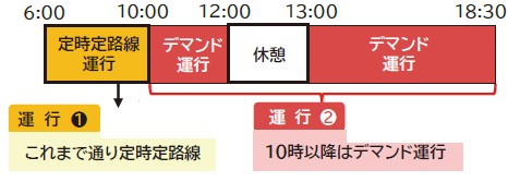 10月1日からデマンド運行の実証実験が始まりますが、10時まではこれまで通りの時刻・経路で定時定路線運行を継続します。定時定路線の便では登録や予約は不要ですので、これまでと同じようにご利用いただけます。