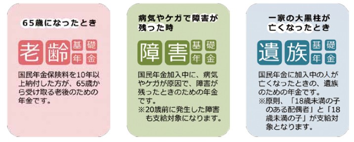 A2 障害や遺族に対する保障もあります。国民年金加入中に病気やケガで障害を負うなど、一定の障害の状態にある間は「障害基礎年金」が、また、万一ご本人が亡くなったときは、残された子や子のある配偶者に「遺族基礎年金」が支払われます。