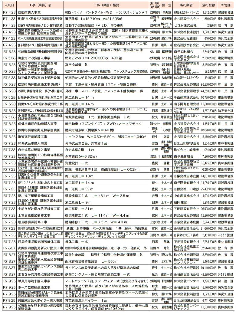 くらし 令和7年4月~令和7年9月までの入札結果の概要 25/30 前の記事 次の記事 発行日 : 2025年10月22日 自治体名 : 愛媛県松野町 広報紙名 : 広報まつの 令和7年11月号 単位:円 Tweet シェアする 年金コーナー 令和7年度公共工事及び建設コンサルタント業務等の発注見通しについて