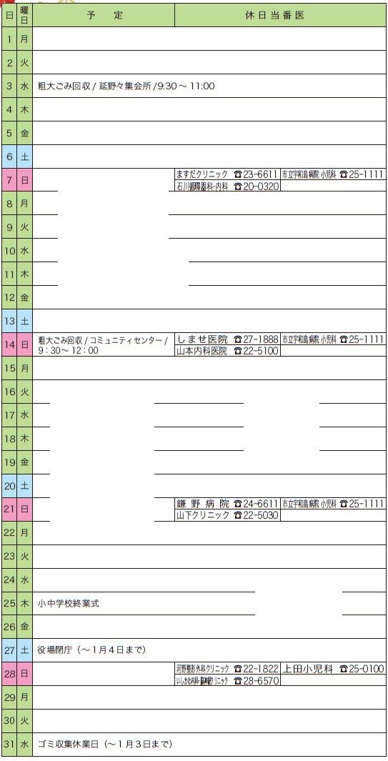 くらし 12月の森の国行事予定表 28/29 前の記事 次の記事 発行日 : 2025年11月21日 自治体名 : 愛媛県松野町 広報紙名 : 広報まつの 令和7年12月号 ※休日当番医は、変更になることがありますので、新聞や電話等で確認し、事前に症状を説明し受診しましょう。 Tweet シェアする ごみ収集日程表 その他のお知らせ(広報まつの 令和7年12月号)