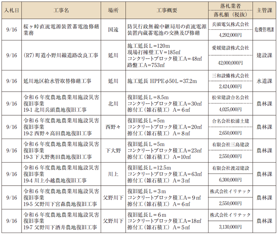 ■〔お知らせInfo〕令和7年度9月の鬼北町工事入札結果