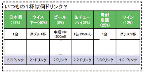 健康にも影響の少ない「節度ある適度な飲酒」とは純アルコールで1日約20グラム程度(2ドリンク)とされています。(女性、高齢者、お酒の弱い方はこれより少ない量が適量です。)