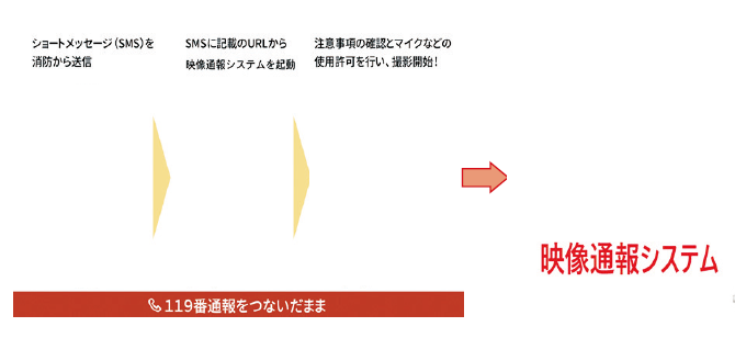 スマートフォンのカメラ機能を利用して、火災や救急などの通報現場の状況を「見える化」する新しい映像通報システムです。このシステムを導入することで、次のようなことが可能になります。