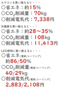 エアコン・テレビ・照明器具・電気冷蔵庫などは、10年前に購入したものに比べて省エネ性能が大幅に向上しています。