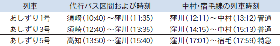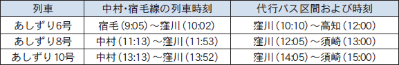 土佐くろしお鉄道(中村・宿毛線)は特急列車を含め通常どおり運行しますが、窪川~高知間は代行バスへの乗り換えが発生しますので、ご理解とご協力をお願いします。※代行バスの乗降駅は、高知・須崎・土佐久礼・窪川です。(普通乗車券で利用可能)
