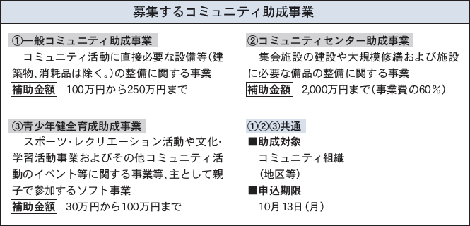 コミュニティ助成事業は、宝くじの社会貢献広報事業として住民の行うコミュニティ活動を推進し、その健全な発展を図るために実施するものです。