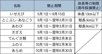 県沿岸部では一部の水産動植物に漁業権が設定されており、その区域の漁業権を持つ漁業協同組合の組合員でなければ採捕を行うことはできません。