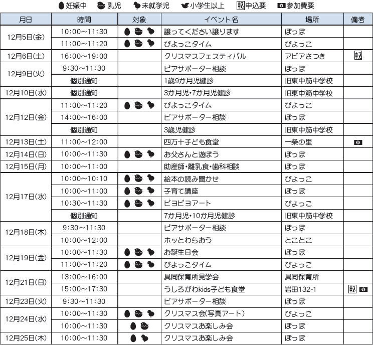 イベントについての問い合わせ・申込先は子育て応援ひろばホームページをご確認ください。