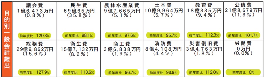 歳入総額は194億4,809万円で、前年度より6億7,710万円(3.6%)増加しました。歳出総額は192億5,884万円で、前年度より8億6,834万円(4.7%)増加しました。奥物部ふるさと物産館、やなせたかし記念館の改修といった施設整備や、災害復旧に係る事業や人件費の増加などが主な理由で、歳入・歳出ともに増加しています。
