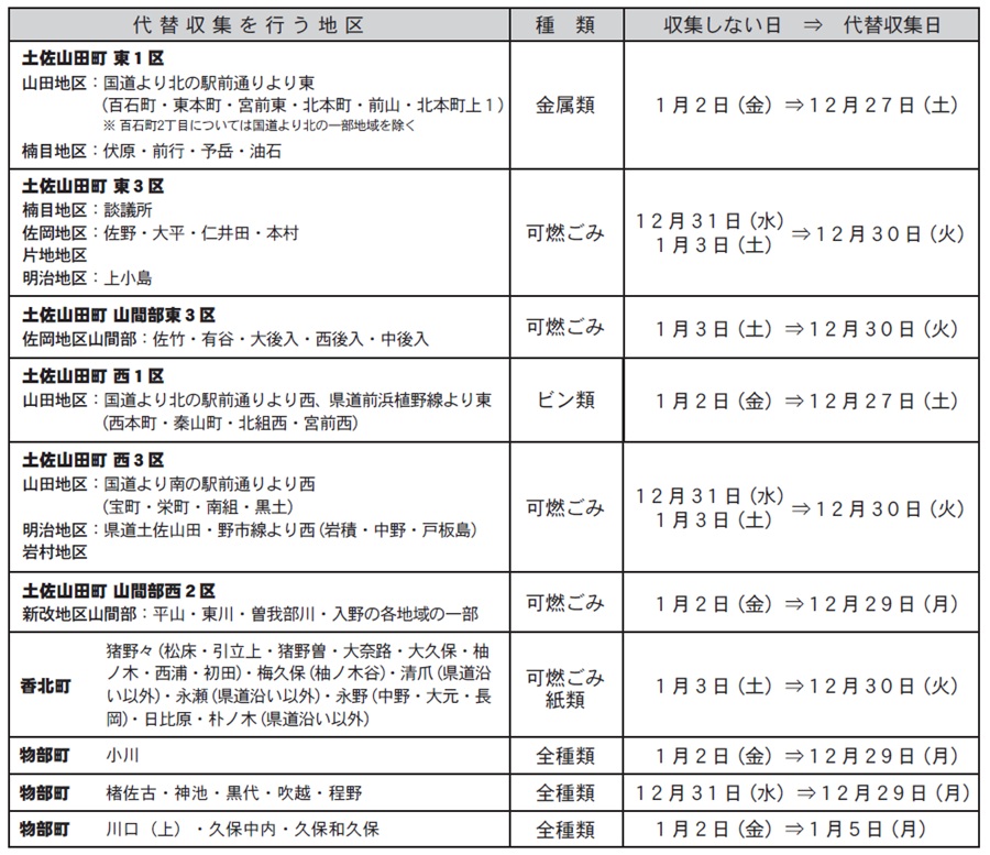 代替収集を行う地区は次の表のとおりで、表にない地区の代替収集は行いません。
