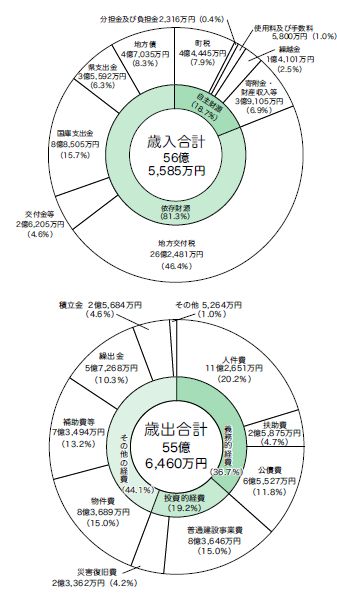 歳出の内訳は、性質別に見ると、人件費・扶助費・公債費の「義務的経費」は20億4054万円で歳出全体に占める割合は36・7%となっています。そのうち借金を返済する公債費は6億5527万円で昨年度より7132万円減少しました。