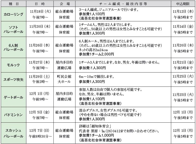 申込先:所定の申込用紙に必要事項を記入のうえ、各種目の申込期限(上記)までに町民会館へお申し込みください。なお、FAXおよびメールも可能としますが、その際は電話での申し込みの確認をお願いします。