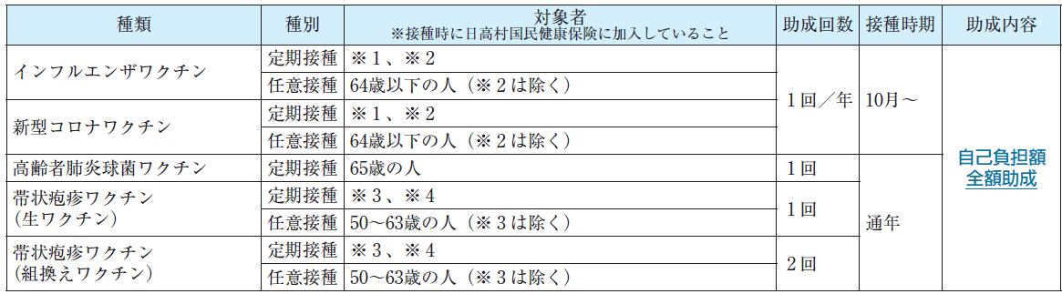 日高村国民健康保険に加入している人がワクチン予防接種を受けた場合、接種に係る自己負担額について下記のとおり助成します。希望する人は医療機関で接種した後、住民課で申請してください。