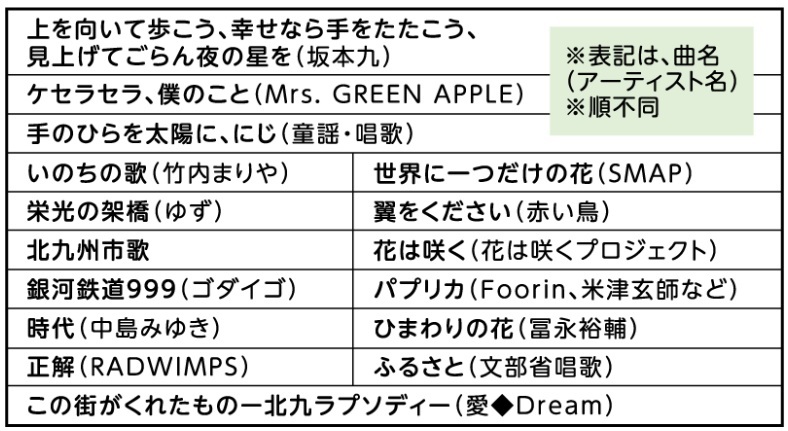 7〜9月に実施したアンケートでは、1698件の回答をいただきました。得票数の多かった20曲(上表)は、今後開催される音楽イベントなどで活用していきます。