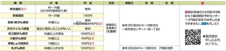検診についての申し込み:(1)集団検診予約センター【電話】0570-783-077か【電話】093-953-6168