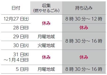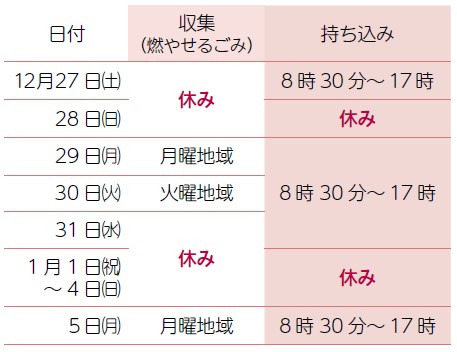 年末年始は、各ごみ処理施設が大変混雑します。事前に分別し、時間に余裕を持って持ち込んでください。粗大ごみ収集日が1月5日(月)から9日(金)の校区の人は、12月26日(金)までに申し込みをしてください。