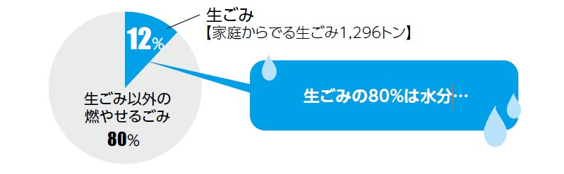 家庭から出る「燃やせるごみ」のうち、12%が生ごみです。その生ごみ、実は約80%が水分を含んでいることをご存じですか?水分が多いと、ごみ処理施設での焼却に時間がかかり、たくさんのエネルギーを使って燃やす必要があります。