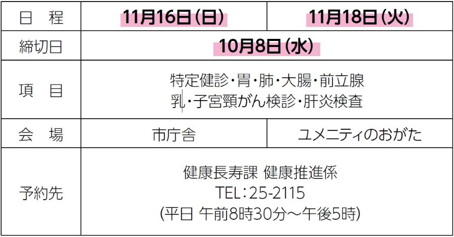 健康 集団健診の予約、お済みですか?~10月8日が予約のラストチャンス!!~ 5/40 前の記事 次の記事 発行日 : 2025年10月01日 自治体名 : 福岡県直方市 広報紙名 : 市報のおがた 令和7年10月1日号 令和7年度の集団健診は11月で終了します。 集団健診での受診を希望し、予約をしていない人はお急ぎください。 予約が定員に達していた場合、ご希望に添えない場合もあります。 Tweet シェアする 10月はピンクリボン月間 高齢者予防接種のお知らせ~10月1日から開始です~