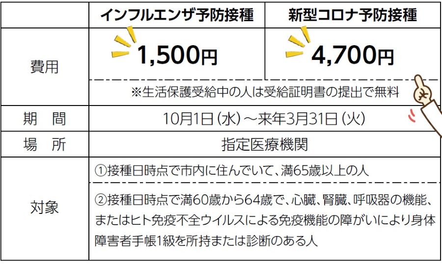 10月より、インフルエンザと新型コロナウイルス予防接種が始まります。インフルエンザは冬に流行しやすいため、12月までに接種を終えることをおすすめします。