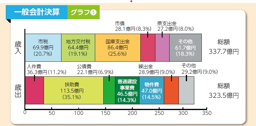 令和6年度は、一般会計(※1)の歳入総額が約337億7千万円、歳出総額が約323億5千万円、収入から支出を差し引いた収支(形式収支)は約14億2千万円の黒字です。