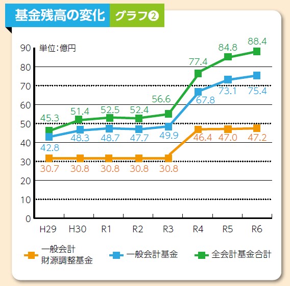 基金残高は約88億4千万円、このうち一般会計分は約75億4千万円、一般会計分の中でも使いみちが特定されていない財源の調整に使える基金は約47億2千万円です。