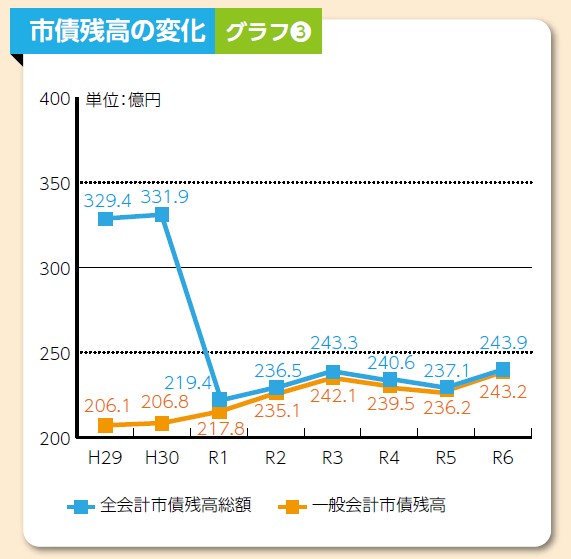 次に市の借金である市債残高は、一般会計とその他特別会計も含めた総額で約243億9千万円となり、前年度に比べて約6億8千万円の増となっています。