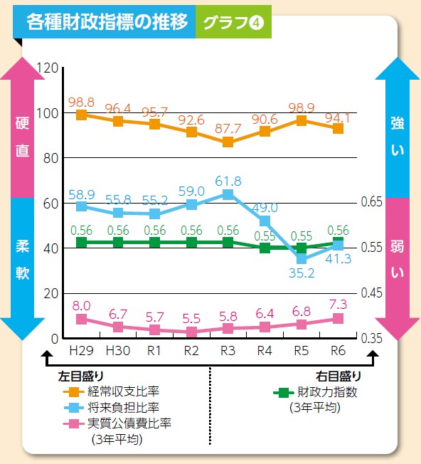 これは、直方市の財政運営が依然として、国の地方財政計画等によって大きく左右される状況にあるといえ、これらの依存財源のうち主なものである地方交付税については、増加傾向となっています。自主財源のうち市税については、定額減税の実施により、減額となりました。
