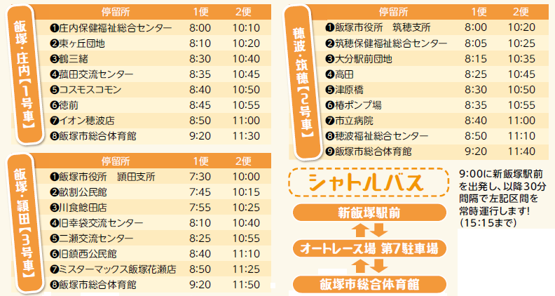 ※帰りのバスは飯塚市総合体育館を15:15に出発します(雨天等で早くなる場合があります)。