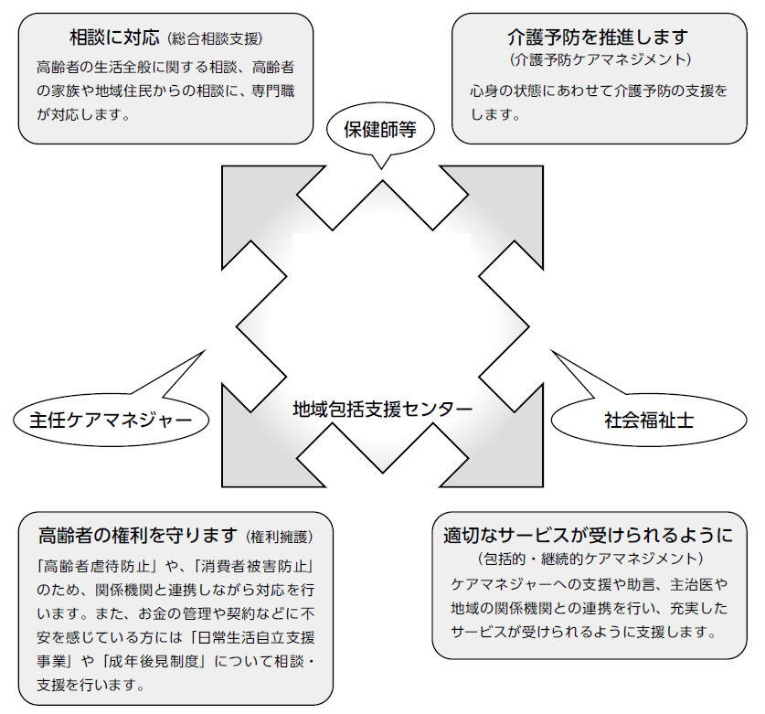 介護・医療・保健・福祉などの分野から高齢者を支える「総合相談窓口」です。専門職員が相談に応じており、高齢者が住み慣れた地域で安心した生活を続けられるように、介護サービスや介護予防サービス、保健福祉サービス、日常生活支援などの相談を行います。
