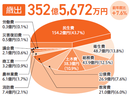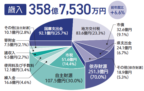 決算額としては、歳入は前年度から6.6%増加して358億7千530万円、歳出は前年度から7.6%増加して352億5千672万円でした。