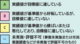 令和5年度にA判定であった施策のうち8施策が「-」判定となるなど、令和6年度はA判定の減少と「-」判定の増加が目立ちました。これは、令和6年度が市民意識調査の実施年度ではなかったため、多くの事業が「市民意識調査の未実施に伴う評価不可」の判定となったことが主な要因です。