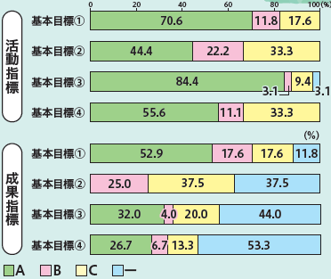 基本目標1から4までの判定の合計は、活動指標のA判定の割合が高くなっています。