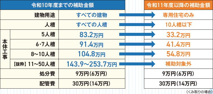 市内において、くみ取り便槽や単独処理浄化槽を合併処理浄化槽へ付け替えるための費用の一部を市が補助します。