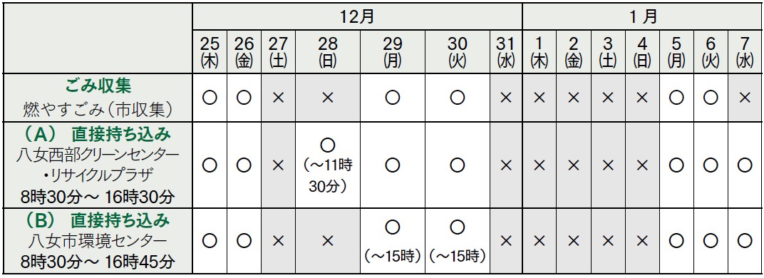 年末年始のごみの収集日は表1のとおりです。この期間は、ごみの量の増加が見込まれ、交通事情などにより収集時間が変わることがあります。燃やすごみは、収集日当日の朝8時30分までに出してください。