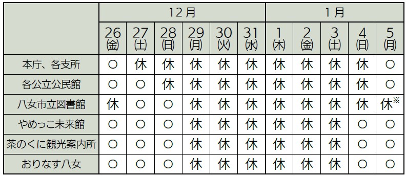 ※主な施設の年末年始のお休み期間は、下記の表2をご覧ください。