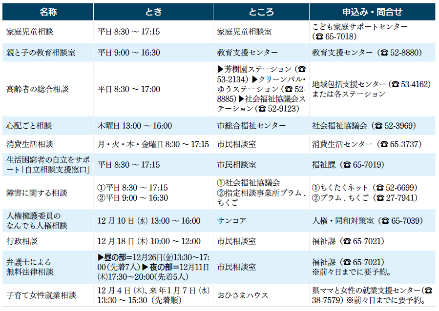 くらし 相談事業 29/33 前の記事 次の記事 発行日 : 2025年12月01日 自治体名 : 福岡県筑後市 広報紙名 : 広報ちくご 令和7年12月号 ※窓口によって祝日や年末年始などの対応が異なります。 Tweet シェアする ちくご日和 まちの話題 電話相談