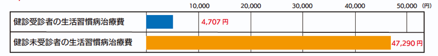 ▽特定健診を受けた人と受けていない人の「生活習慣病治療にかかった医療費」を比べると、42,583円の差があることがわかりました。