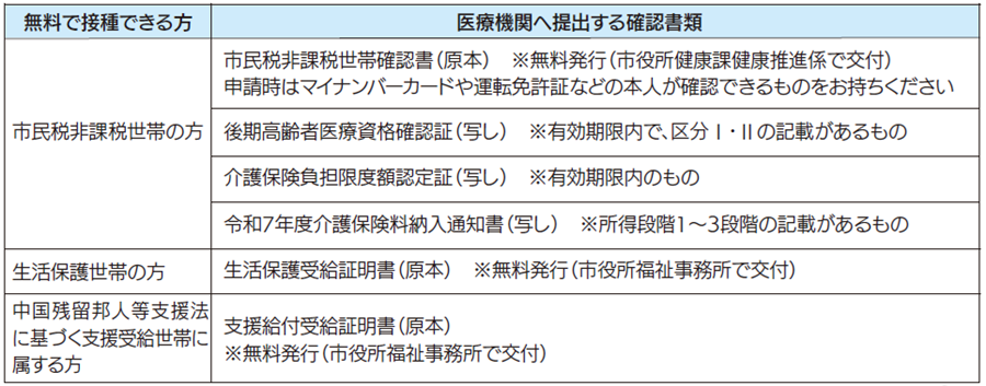 対象者のうち、下記に該当する方で確認書類のいずれか1つを接種当日に医療機関へ提出した人は無料で接種できます。