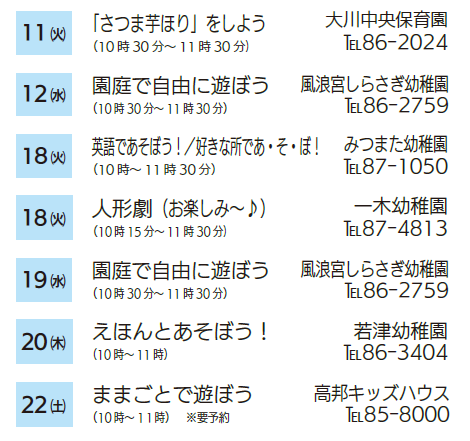 ・12日(水)、10時~ 1・2・3歳児親子教室