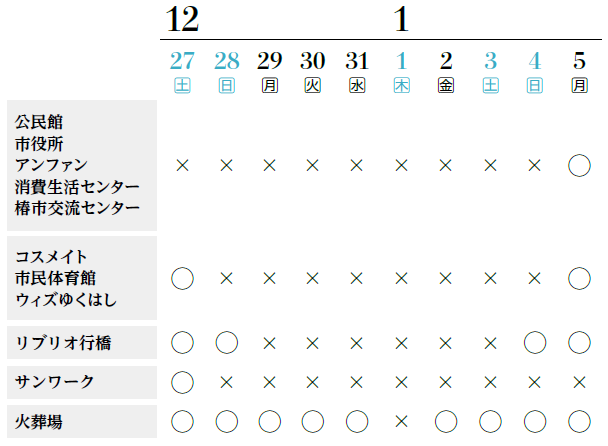 多くの公共施設は、26日(金)にて御用納めとなります。また、リブリオも28日日までとなりますので、年末年始に読書をされる方は注意が必要です。