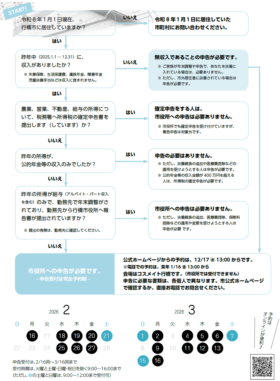 くらし 税の申告準備をはじめよう 申告のご予約はお早めに! 12/30 前の記事 次の記事 発行日 : 2025年12月01日 自治体名 : 福岡県行橋市 広報紙名 : 広報ゆくはし 令和7年12月号 問合せ:税務課 【電話】内線1133 【ID】0024673 Tweet シェアする ヘルスandケア(2) 暮らしの情報 ―お知らせ