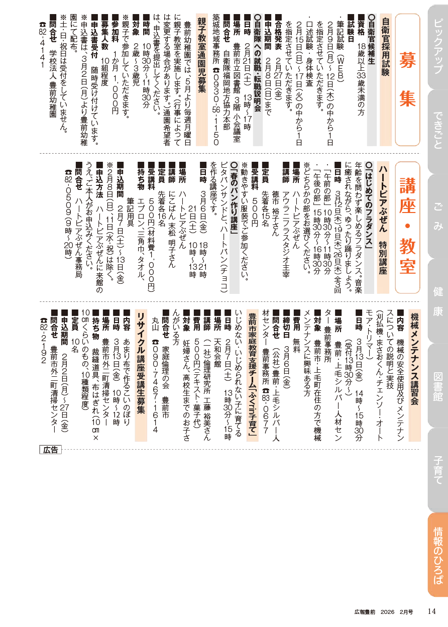 その他 広報豊前 令和8年2月号 14面 14/22 前の記事 次の記事 発行日 : 2026年01月31日 自治体名 : 福岡県豊前市 広報紙名 : 広報豊前 令和8年2月号 Tweet シェアする 広報豊前 令和8年2月号 13面 広報豊前 令和8年2月号 15面