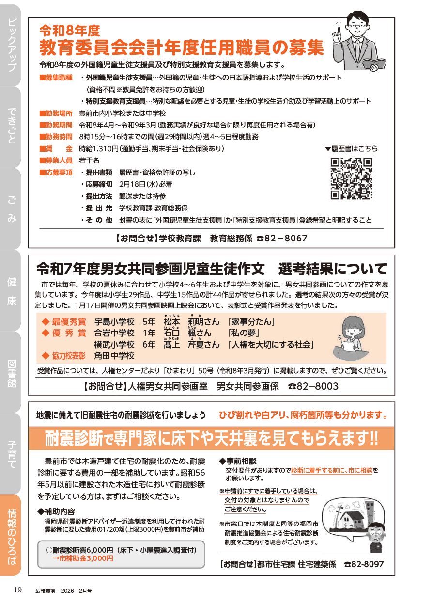その他 広報豊前 令和8年2月号 19面 19/22 前の記事 次の記事 発行日 : 2026年01月31日 自治体名 : 福岡県豊前市 広報紙名 : 広報豊前 令和8年2月号 Tweet シェアする 広報豊前 令和8年2月号 18面 広報豊前 令和8年2月号 20面