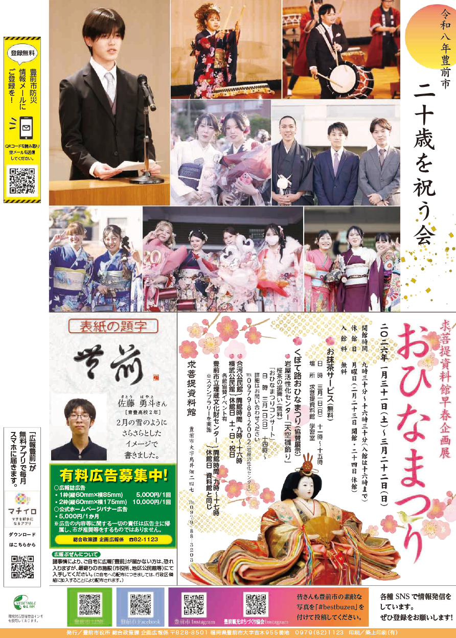 その他 広報豊前 令和8年2月号 裏表紙 22/22 前の記事 発行日 : 2026年01月31日 自治体名 : 福岡県豊前市 広報紙名 : 広報豊前 令和8年2月号 Tweet シェアする 広報豊前 令和8年2月号 21面